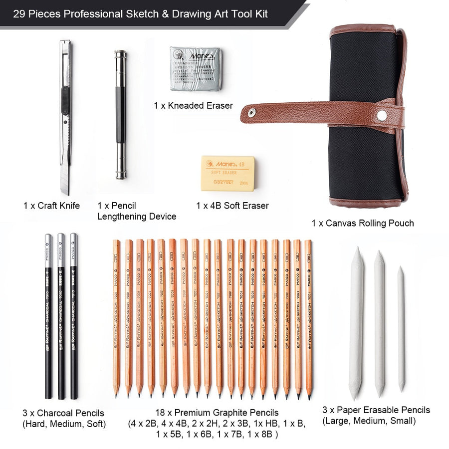 29 Pieces Professional Sketch & Drawing Art Tool Kit With Graphite Pencils, Charcoal Pencils, Paper Erasable Pen, Craft Knife